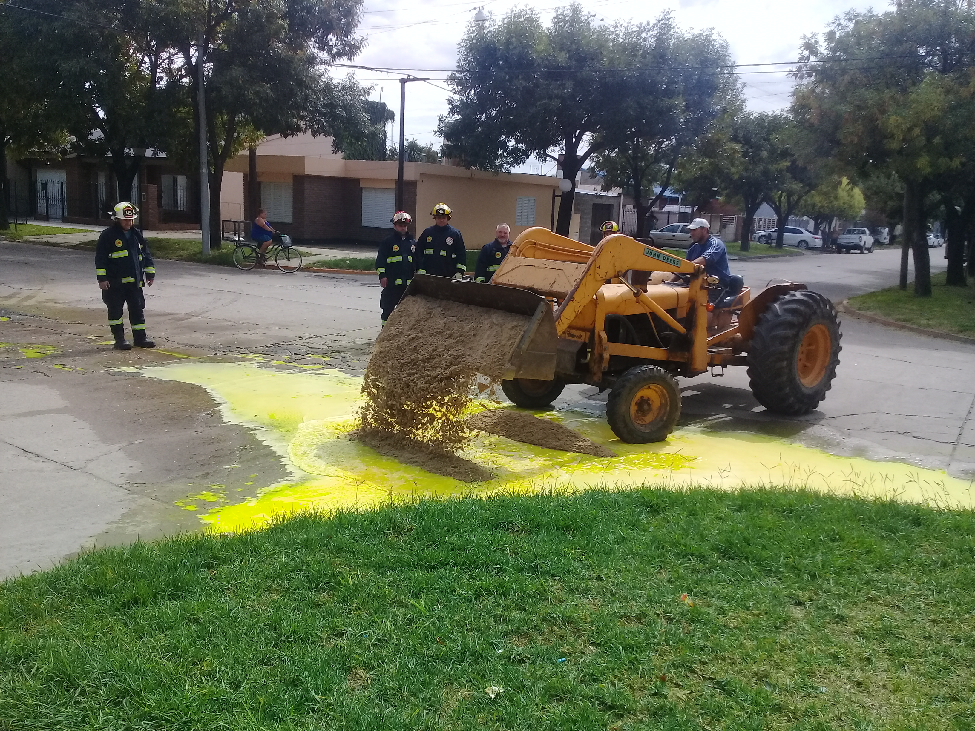 El problema se originó cuando de una camioneta, 8.30 hs. aproximadamente, estacionada sobre calle 9 se tumbó una lata con pintura amarilla. Quienes habitan en el lugar estuvieron lavando parte de la calle y la cuneta que forma con el cordón del pavimento, pero al llegar a la esquina pintura más agua, se originó un importante charco que tuvo que ser absorbido con arena que traía la pala de Municipalidad, que era distribuida por los Bomberos con palas sobre el charco y cuando la arena absorbía el líquido era retirada nuevamente con la misma pala para llevarla a la maestranza.