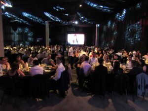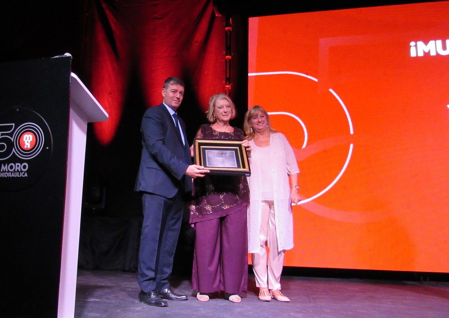 Ya en el sector acondicionado para este evento, Mauricio Gallardo, presentador profesional, anunciaba la entrega de un presente para la titular de Moro Hidráulica Yolanda Duranti de Moro, plaqueta entregada por sus hijos Mariano y Sandra; en reconocimiento al esfuerzo desplegado en la Firma cuando ya no estaba su creador Abel “Tito” Moro. Hubo una proyección en las pantallas instaladas en el lugar, para que todos tengan la posibilidad de estar cerca de una de ellas y apreciar en imágenes y voz, lo que se narraba en la misma. El video fue muy emocionante porque cada uno de los que le pusieron el hombro en aquel momento difícil para todos, contaron su experiencia y lo vivido por aquellos años.