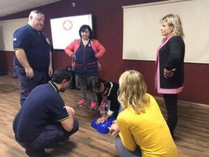 dijo que pasada esta maniobra y que no se llegue a concretarlo vendrá el desvanecimiento, “de allí es que hay que tomarla a la persona de atrás para que se caiga sobre nuestros brazos para poder colocarla sobre el piso, y allí se generará una maniobra similar, que es boca arriba, uno puesto a caballito de esta persona y tratar con las manos desde el ombligo hacia arriba intentemos forzar el aire que quedó en los pulmones, es muy simple, la gente que se capacitó lo practicó y creemos que eso ayuda; ya tenemos más de 700 personas que han estado en las capacitaciones”.
