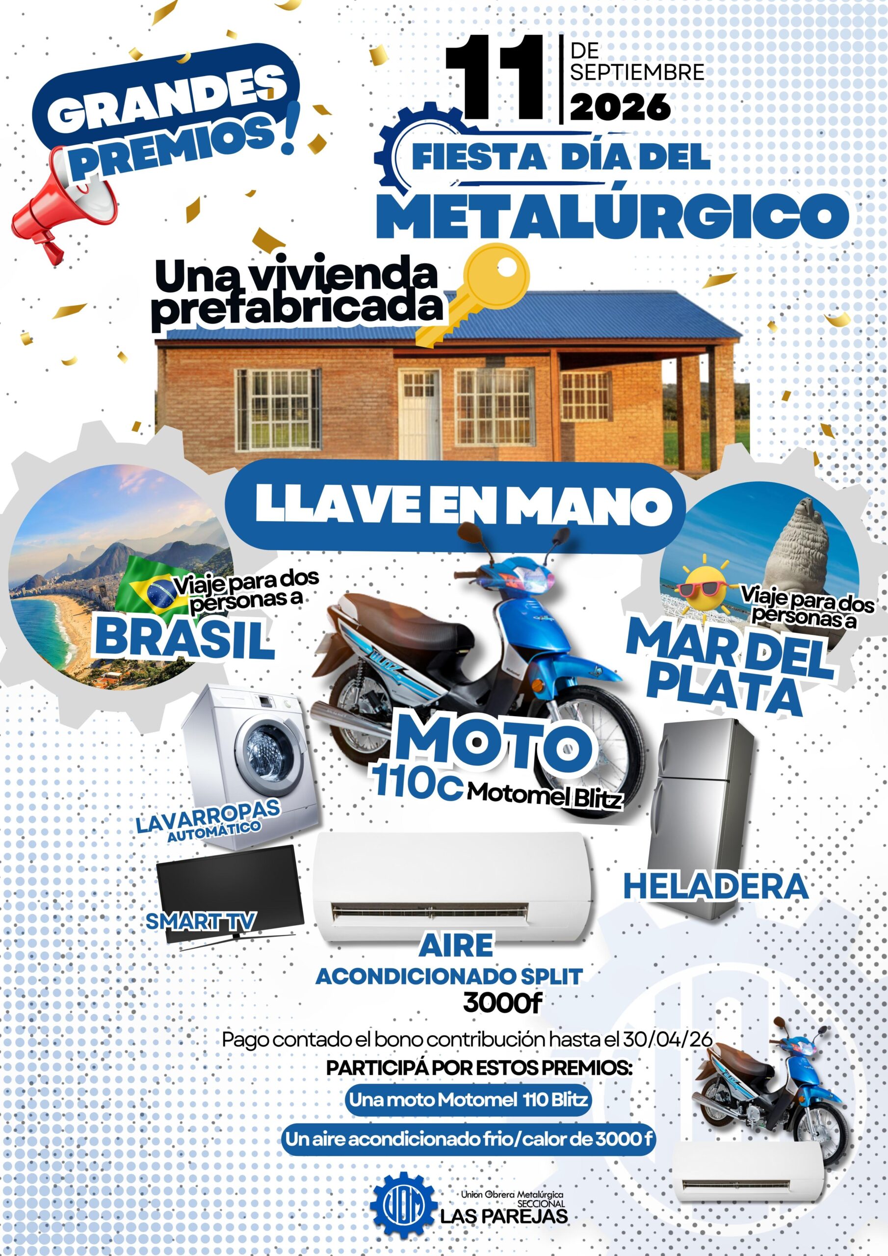 “Los premios serán sorteados el viernes 11 de septiembre de 2026 de manera presencial, la misma noche del evento; 8º premio una Smart de 50”; 7º premio un lavarropas automático; 6º premio una heladera; 5º premio un aire acondicionado frio calor de 3000 frigorías; 4º un viaje a Mar del Plata para dos personas con media pensión, 3º premio una moto 0 km. 110 cc,; 2º un viaje a Brasil para dos personas con media pensión y el primer premio una Vivienda Prefabricada llave en mano. Esperamos una buena venta del Bono, ya que la vivienda es una necesidad básica para todos los trabajadores”.